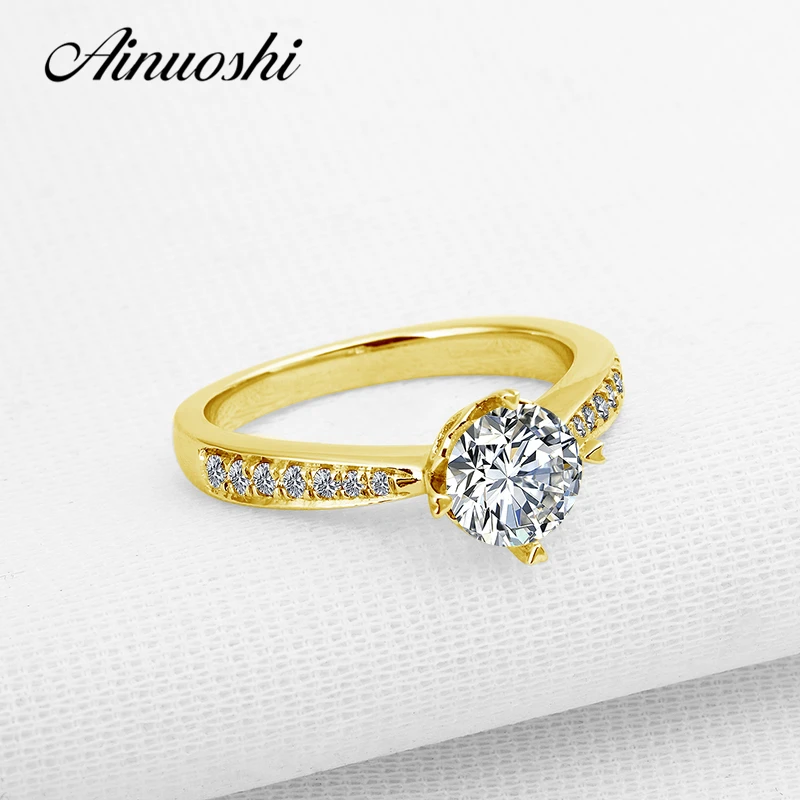 Ainuoshi 10 K Padat Kuning Emas Kuning Emas Wanita Pernikahan Cincin 1 Ct Round Cut Disimulasikan Diamond Karat